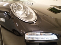 ハロゲンヘッドランプの約2倍の光量を誇る“キセノンヘッドランプ”内にフラップを装着し、ハイビーム時にも“キセノン光”で照射するというもの。ヘッドライトウォッシャも同時装着されます。また、Type997後期型(2009My)から新たに導入された“LEDコンビネーションランプ”。バンパー形状も変更になり、フロントマスクがすっきりした印象です。