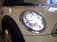 様々なカラーバリエーションを楽しむことの出来るMINIにあって、ルーフのお洒落は外せません。通常仕様のブラックルーフにシルバーのツインストライプステッカーを装着。クラシカルでスポーティな仕上がりになっています。