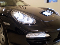 新型デザインへとリファインされて迫力が増したバイキセノンヘッドライトモジュール。ハロゲンヘッドランプの約2倍の光量を誇るキセノンヘッドランプ内にフラップを装着し、ハイビーム時にも“キセノン光”で照射するというもの。ヘッドライトウォッシャも同時装着され、夜間や雨天時の走行安全性に大きく貢献しています。更に進行方向の路面を効果的に照射する為、最大15度の範囲でヘッドライト角度を調整するダイナミックコーナリングライトも同時装着されます。Type987後期型(2009My)以降から新たに導入されたLEDコンビネーションランプや形状変更されたバンパー等、昼夜を問わず一目でボクスターと識別できるデザインに仕上げられています。