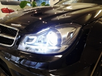 明るさを高めた「バイキセノンヘッドライト」や「インテリジェントライトシステム(カントリーモード/フォグランプ強化機能/ハイウェイモード/アクティブライトシステム/コーナリングライト)」などに加え、「ポジショニングライト」やウインカーにLEDを使用して、C63 Coupe Black Seriesのフロントマスクを精悍に印象付け、夜間走行の安全性を高めます。